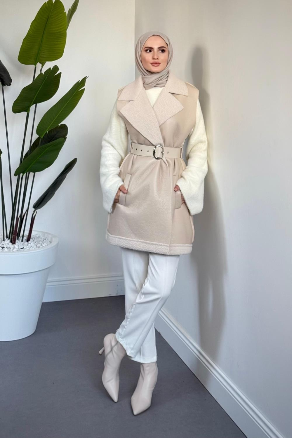 Amarila Deri Görünümlü Yelek Krem (6237)