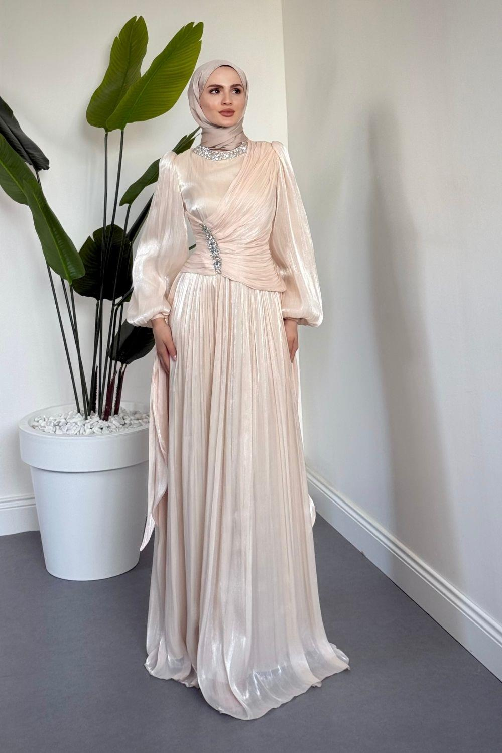 Corlie Beli Taşlı Drapeli Jan Jan Abiye Bej (8019)