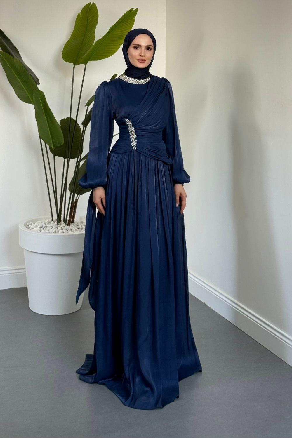 Corlie Beli Taşlı Drapeli Jan Jan Abiye Lacivert (8019)
