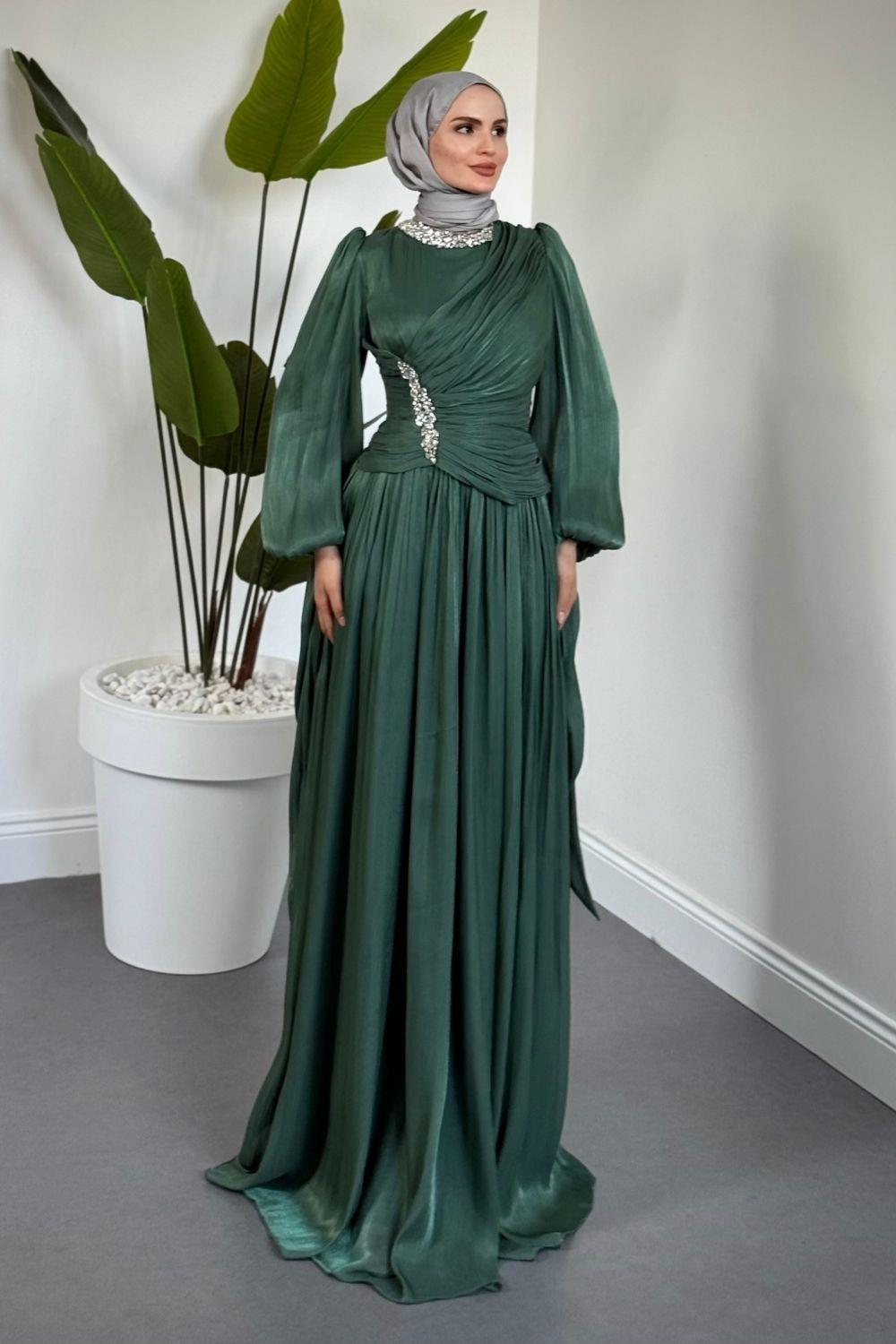 Zarif ve romantik detaylarıyla öne çıkan,ışıltılı dokusu ve taş işlemeleriyle ihtişamlı bir görünüm sunuyor. • Kumaş: Işıltılı ve akıcı dokulu özel kumaş, elbiseye hem sofistike hem de modern bir hava katıyor. • Detaylar: Yaka kısmında ve bel hattında kullanılan taş işlemeler, göz alıcı bir parıltı sağlıyor. • Model: Uzun kollu, tesettüre uygun tasarım; drapeli bel detayı vücuda zarif bir form kazandırıyor. • Kesim: Piliseli etek yapısı, hareket ettikçe akışkan bir şıklık sunuyor.