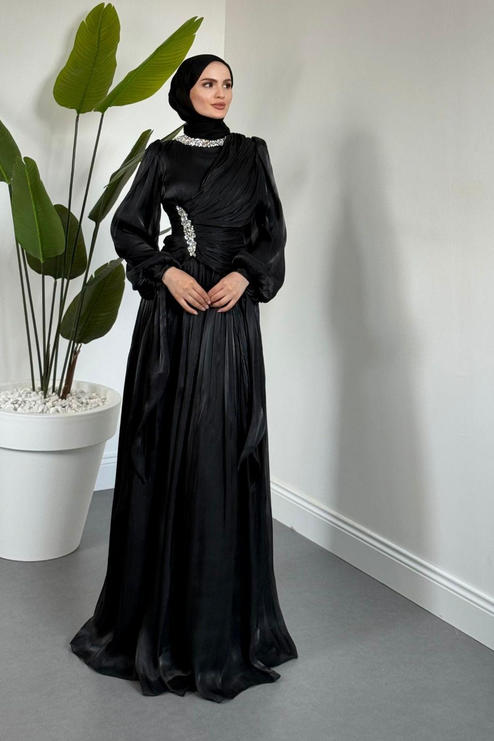 Corlie Beli Taşlı Drapeli Jan Jan Abiye Siyah (8019)
