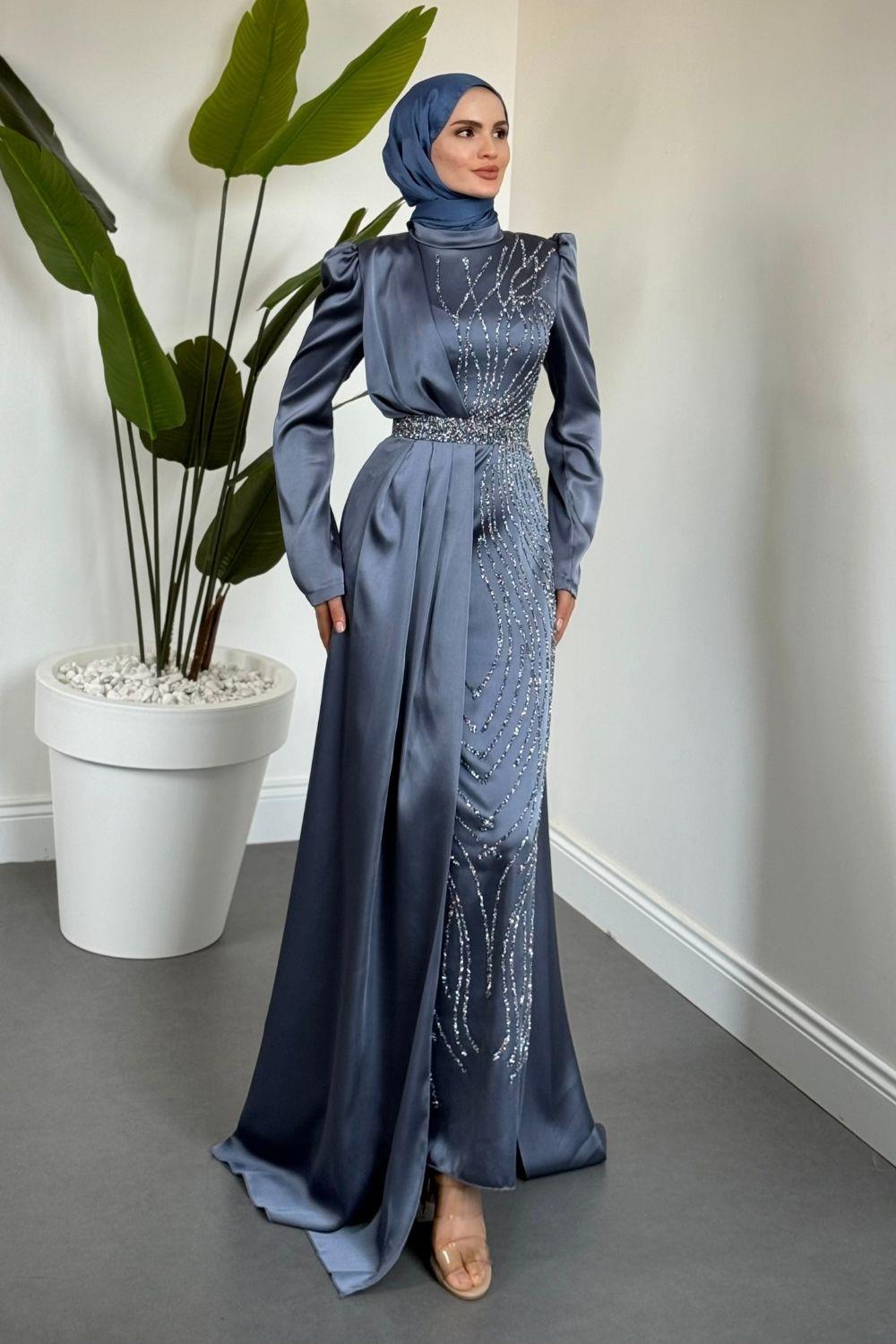 Modern ve ihtişamlı çizgileriyle öne çıkan bu saten abiye elbise, ışıltılı taş işlemeleriyle göz alıcı bir şıklık sunuyor.