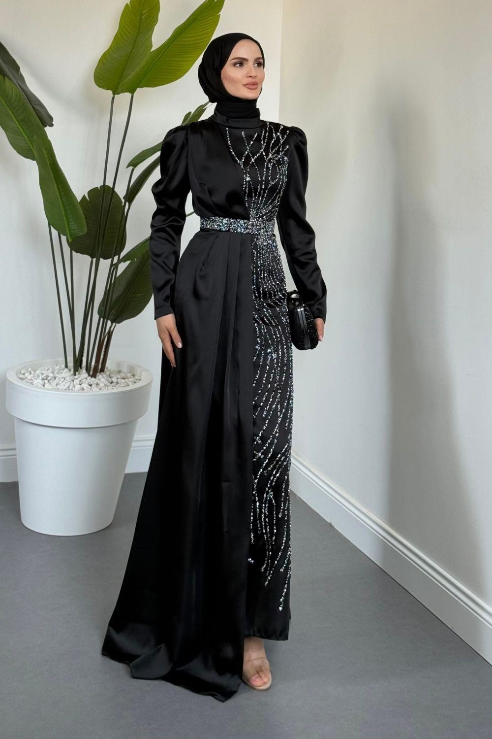 Taş işlemeler elbiseye sofistike bir hava katarken, siyah saten kumaş klasik ve zamansız bir şıklık oluşturuyor.