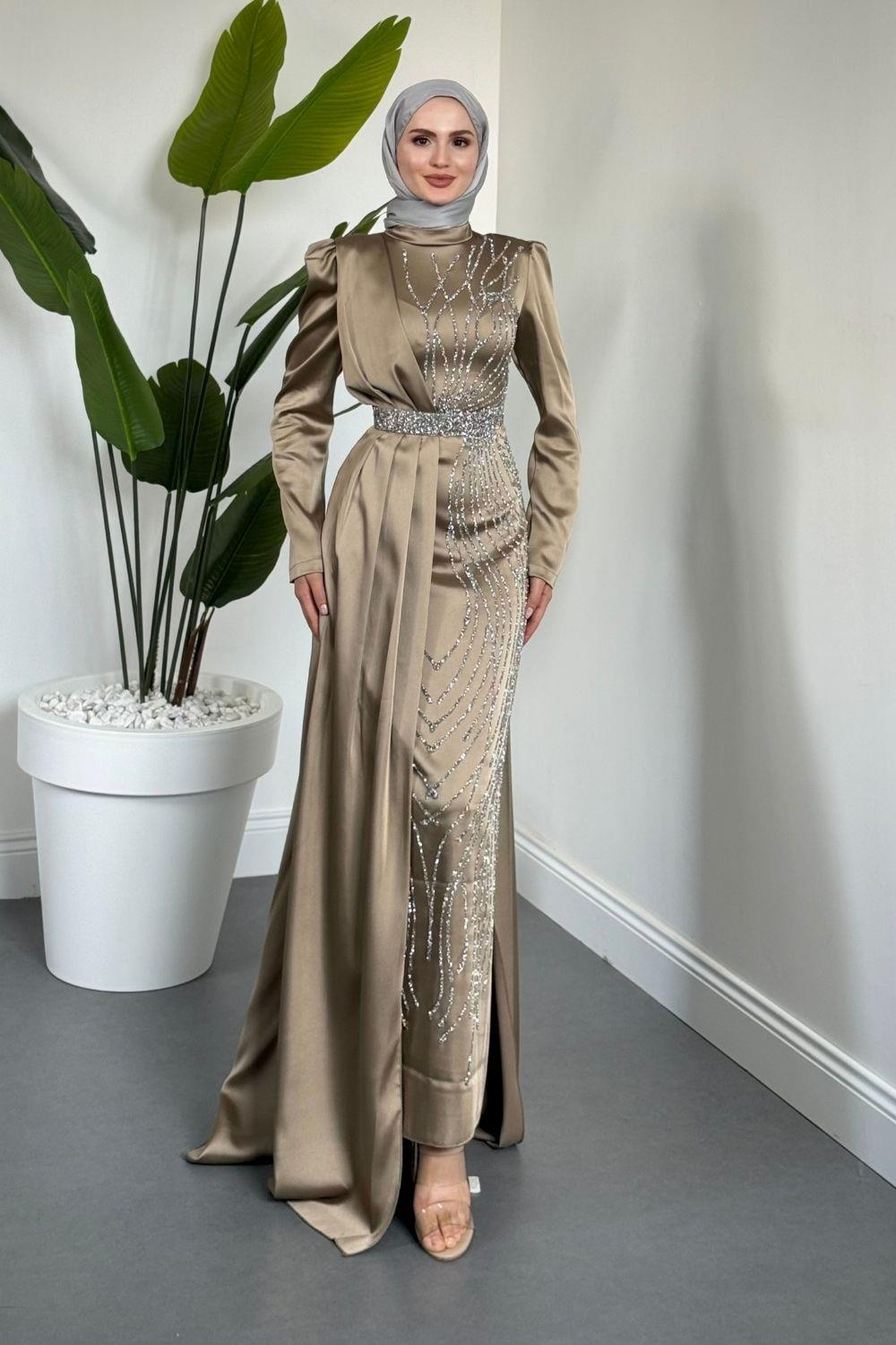 Fery Pelerinli Taşlı Saten Abiye Vizon (8833)