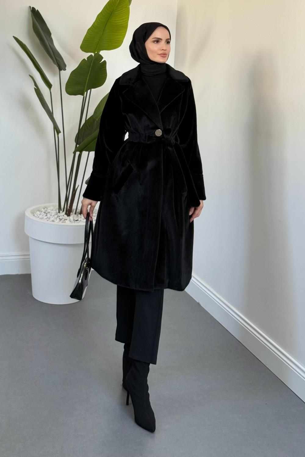 Fringe Astarlı Kaşmir Kaşe Kaban Siyah (6245)
