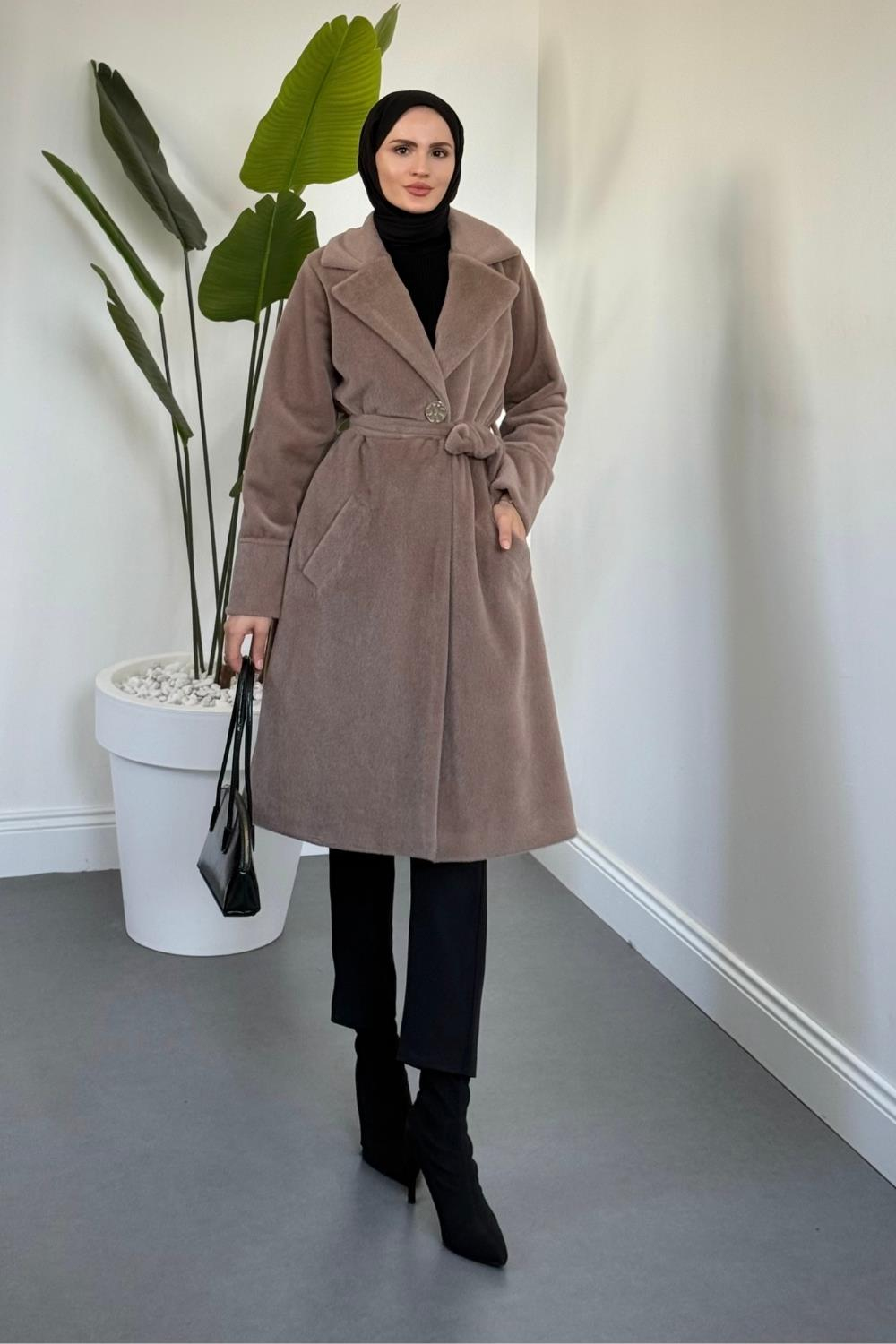 Fringe Astarlı Kaşmir Kaşe Kaban Vizon (6245)