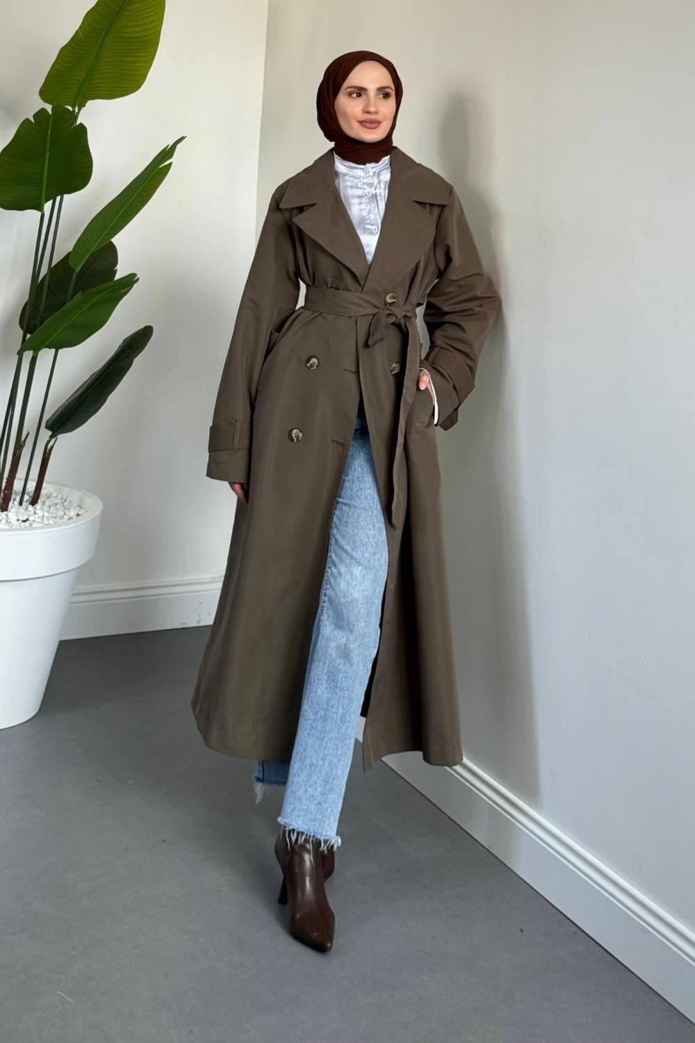 Zarafeti ve zamansız şıklığı bir arada sunan Helora trençkot, kaliteli gabardin kumaşı ile formunu korurken, 120 cm uzunluğu sayesinde tesettür kombinlerinizde ideal bir örtücülük sağlar.