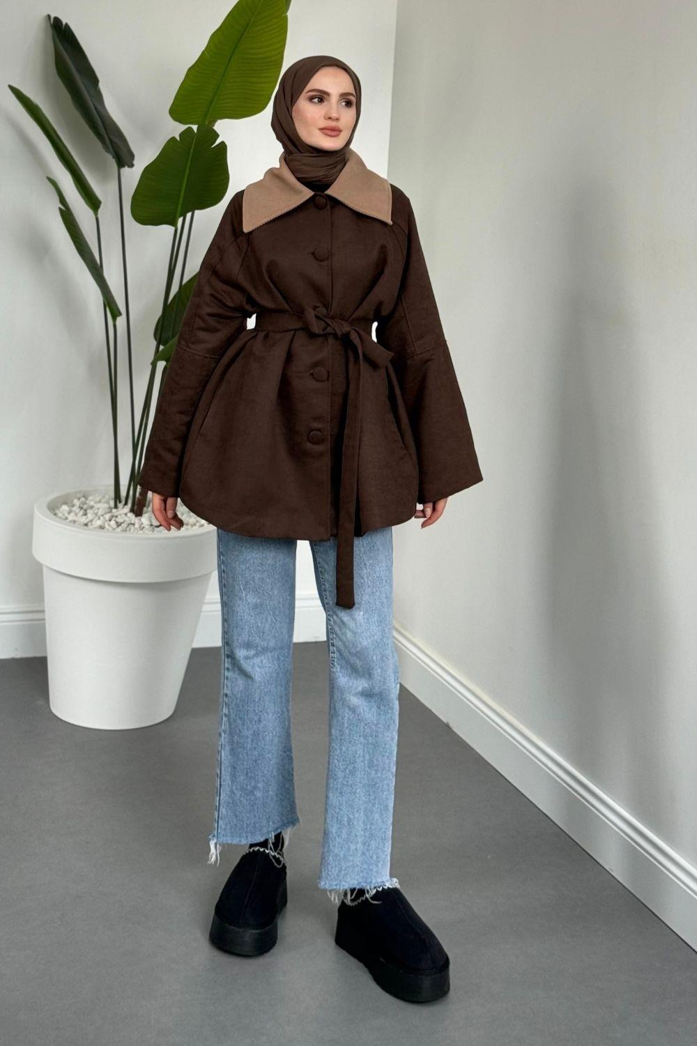 Jan Düğmeli Kuşaklı Kaban Kahverengi