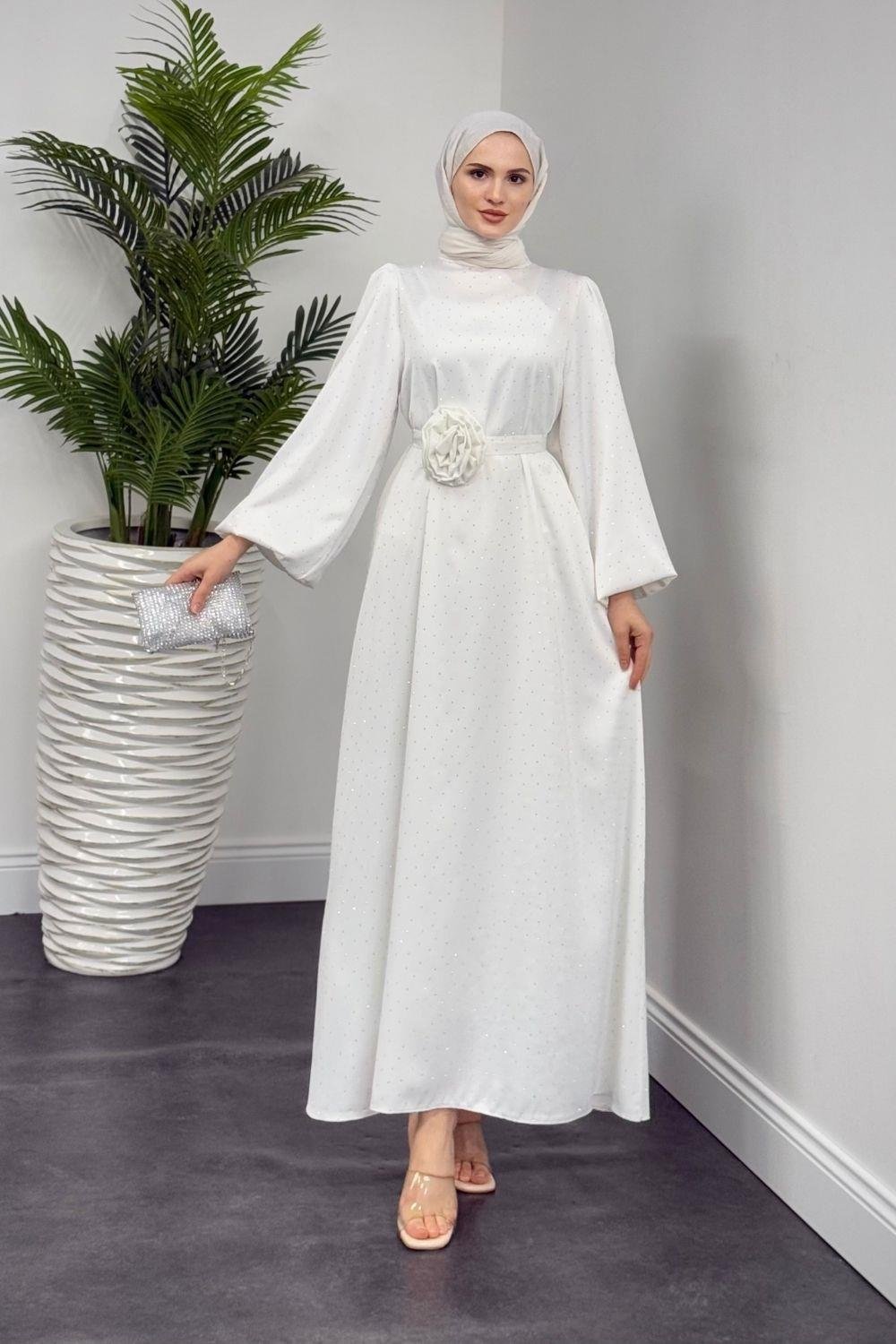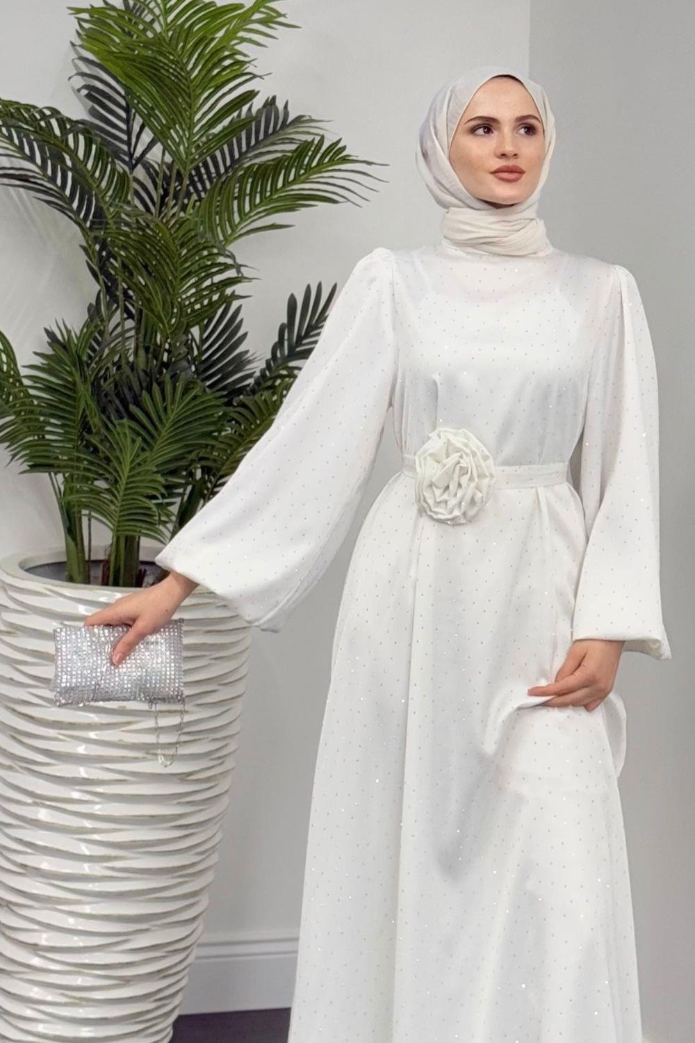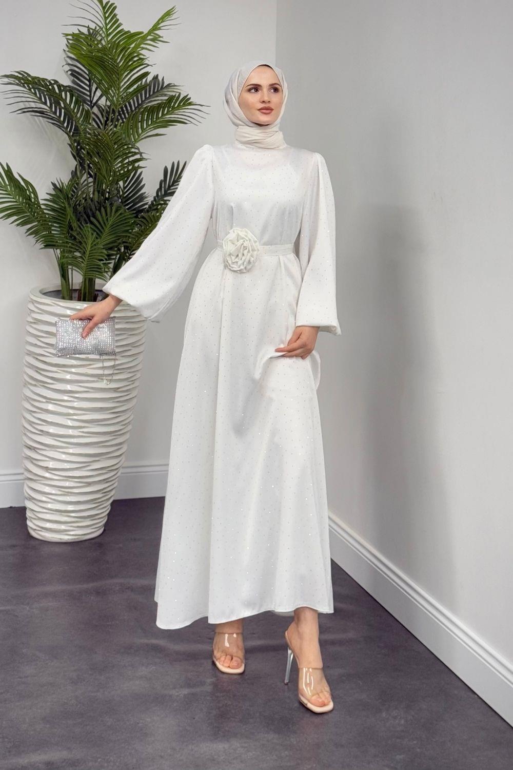 Margherita Taşlı Balon Kol Abiye Beyaz