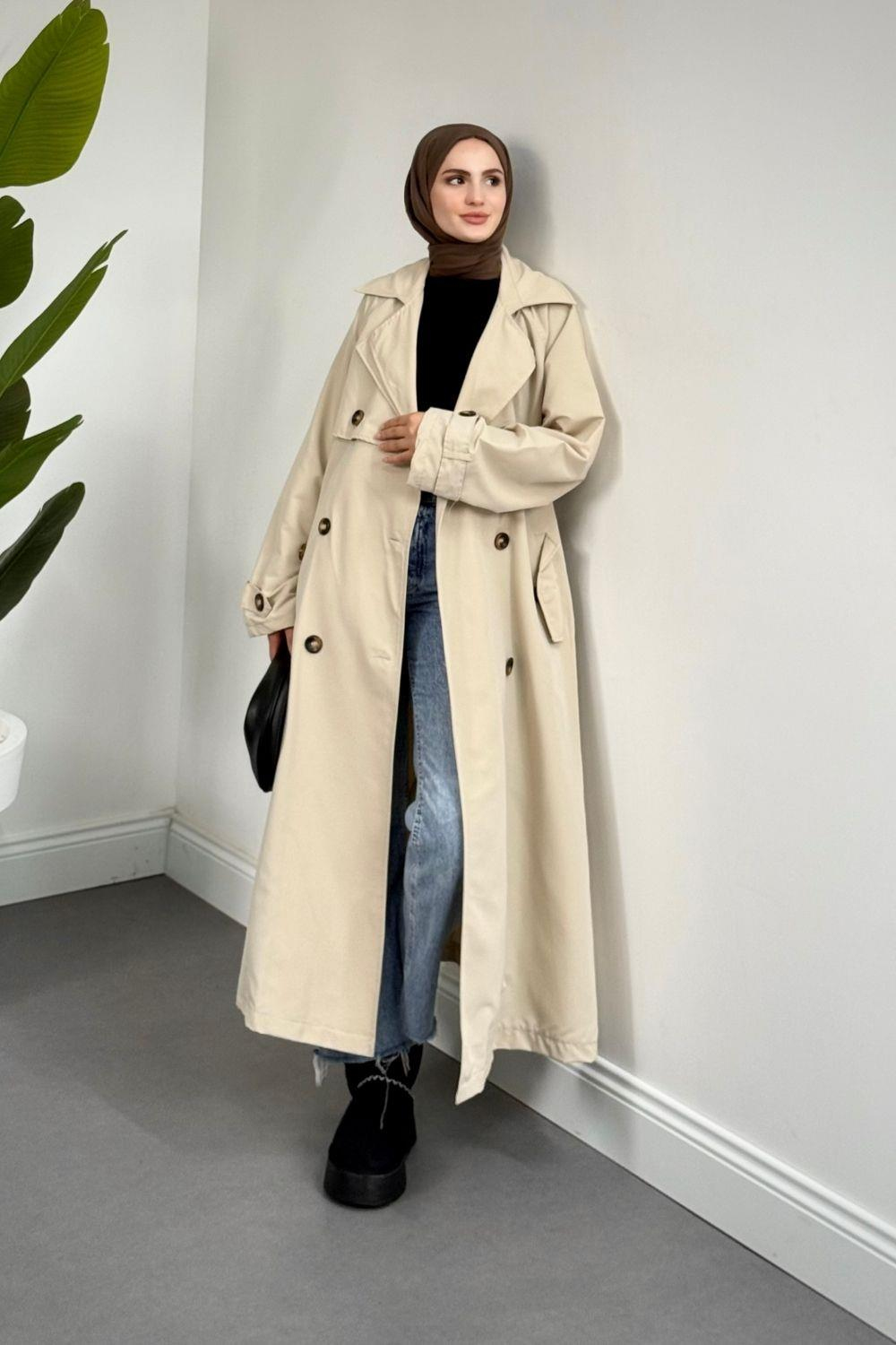 Mayi Arkası Pelerinli Düğmeli Trençkot Bej (5985)