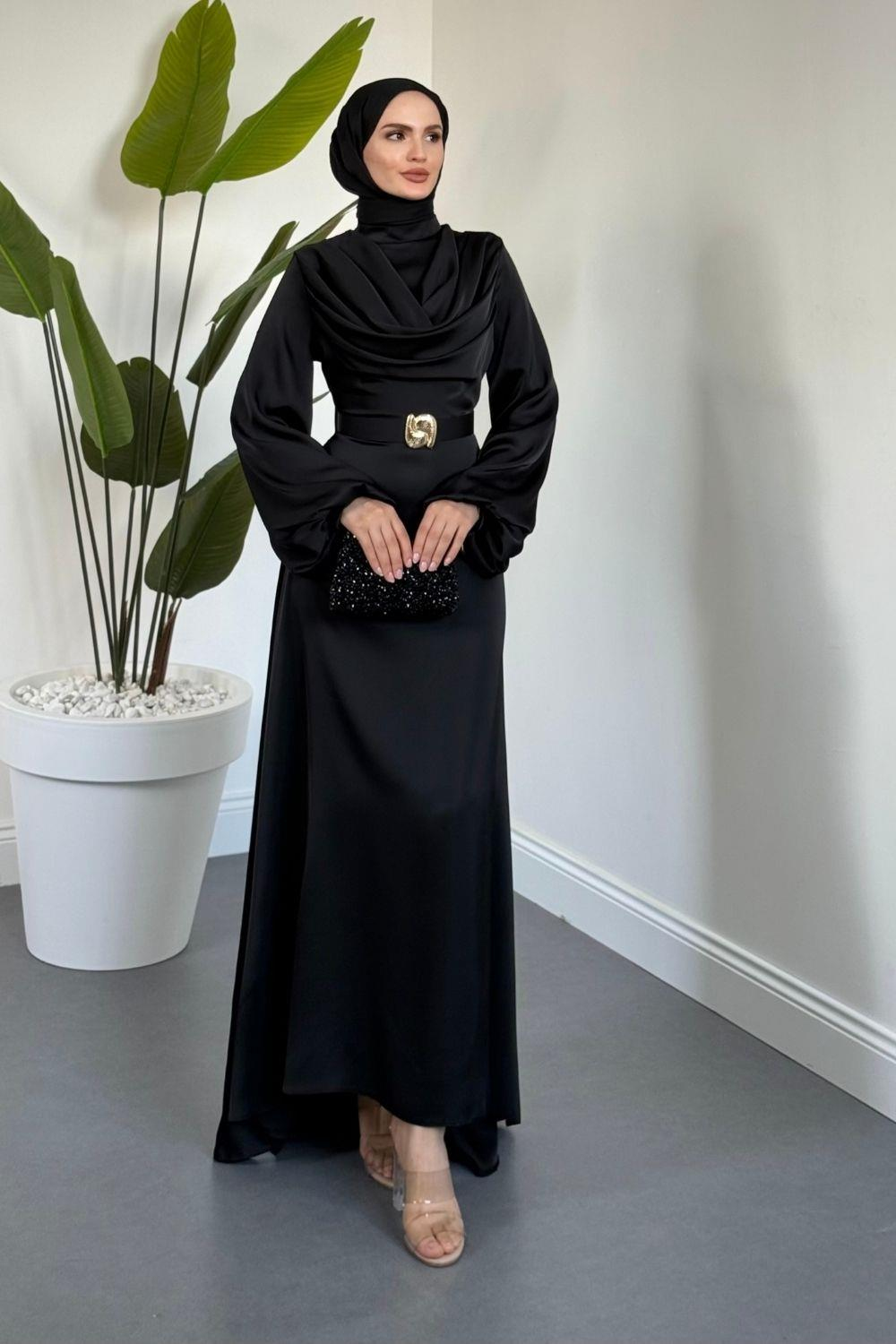 Merryna Kemerli Kuyruklu Saten Abiye Siyah (1162)