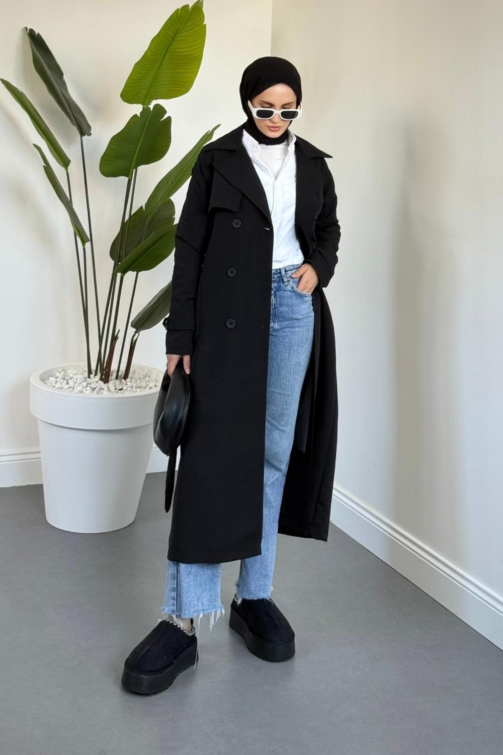 🔸 Çift düğmeli ve kuşaklı tasarımı ile belinizi vurgular, feminen bir siluet oluşturur.