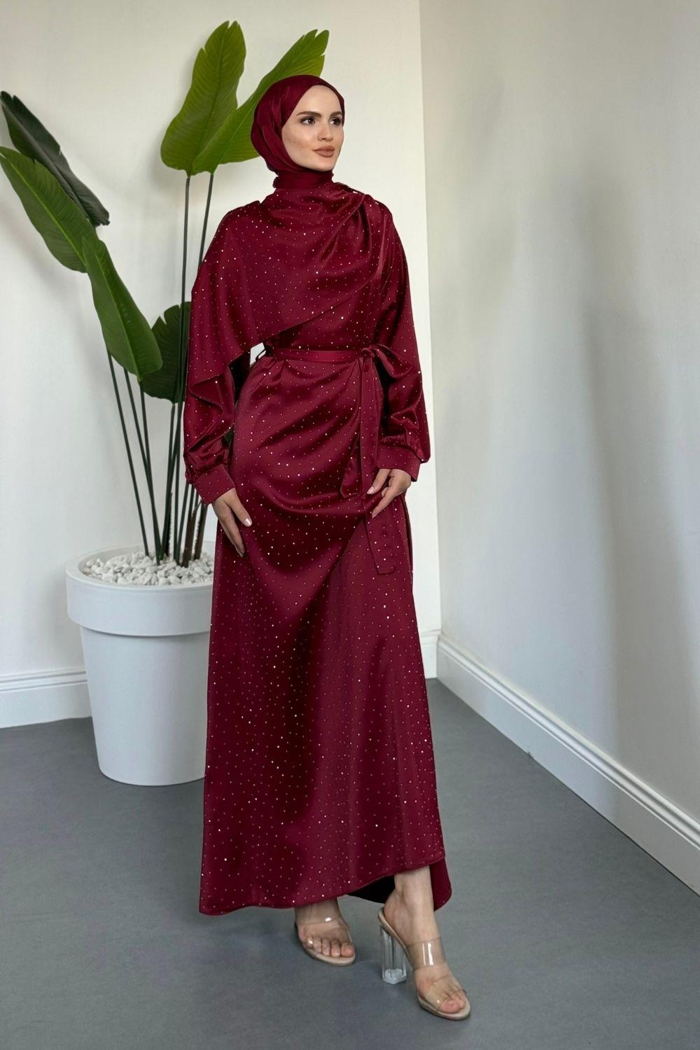 Taş detaylarının zarif parıltısı ve bordo satenin asaletini bir araya getiren bu model, minimal ama dikkat çekici şıklık isteyenler için ideal bir seçimdir.