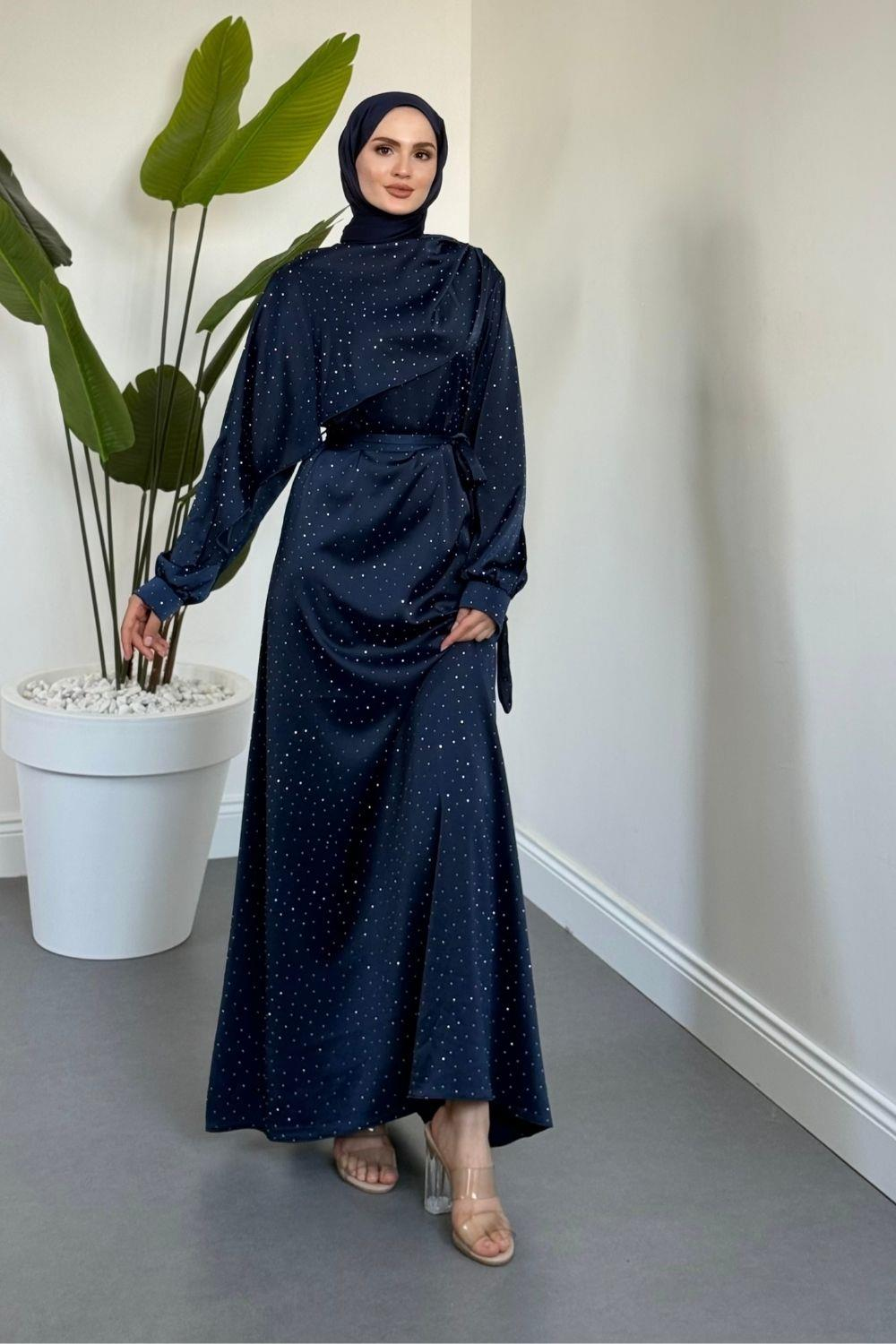 Noelle Taşlı Tek Omzu Pelerinli Abiye Lacivert (1158)