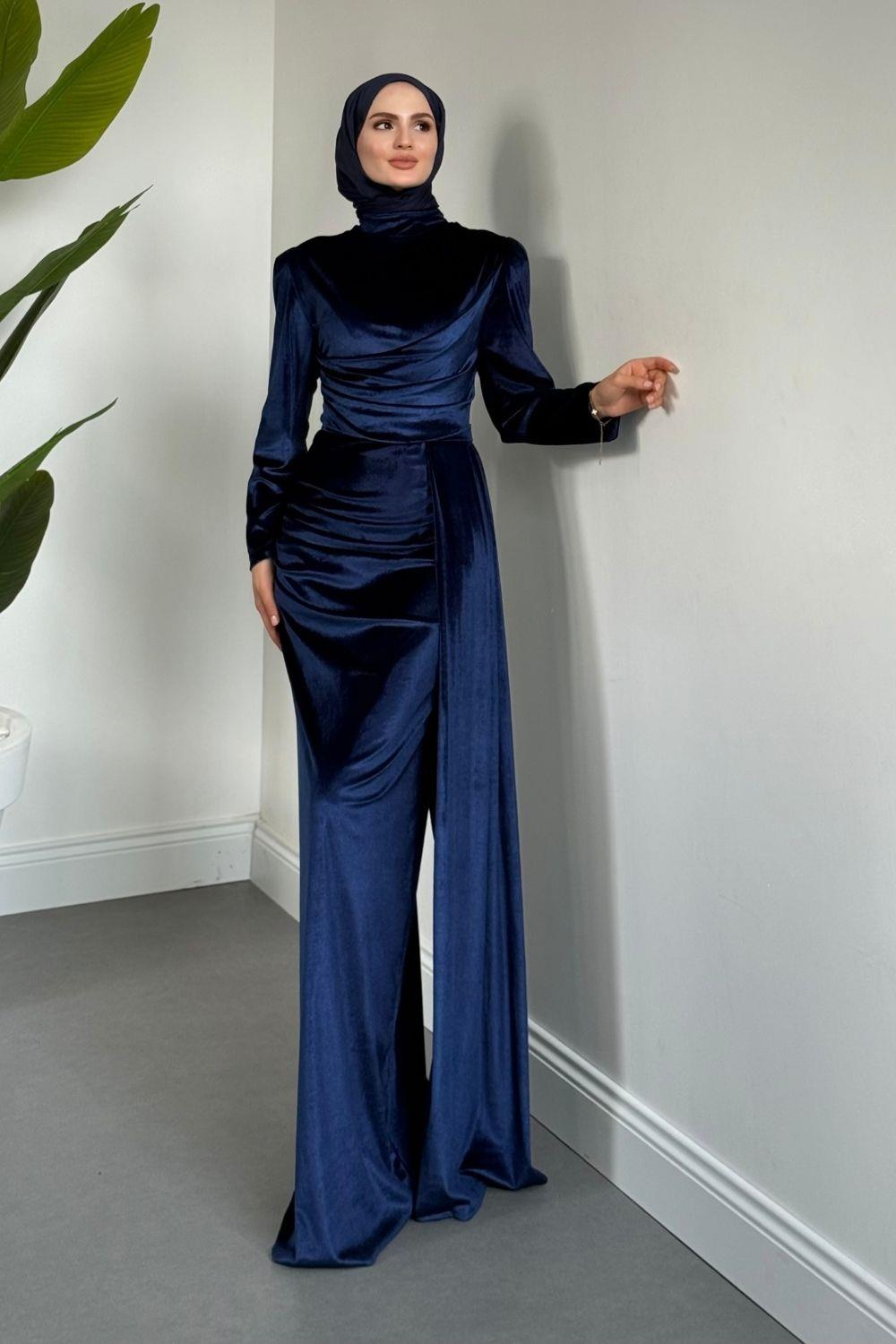 Samy Kadife Kumaş Balık Elbise Lacivert