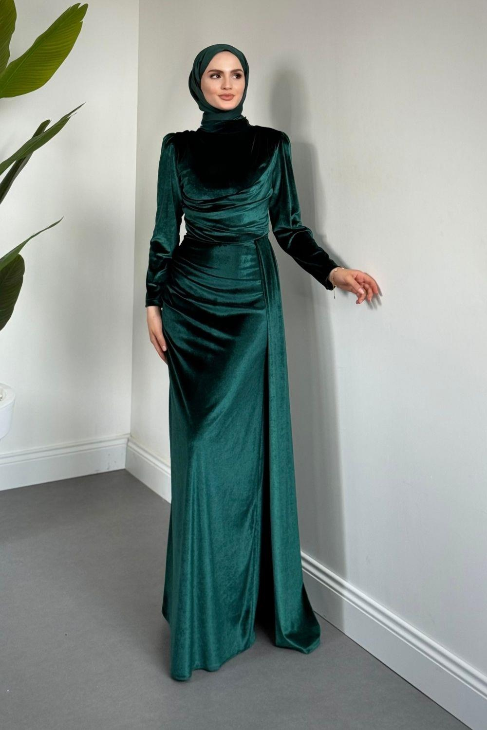 Şıklığı ve asaleti ön planda tutan bu siyah saten görünümlü abiye elbise, özel davetler ve akşam organizasyonları için zarif bir seçenektir. • Kumaş: Işıltılı saten dokusu ile hem asil hem de modern bir duruş sağlar. • Model: Yüksek yakalı, uzun kollu tasarım tesettüre uygun şekilde hazırlanmıştır. • Bel Detayı: Drapeli bel bölgesi ince bir siluet oluşturur, bedeni zarifçe vurgular. • Etek: Düz kesim uzun etek, akıcı duruşuyla şıklığı tamamlar.