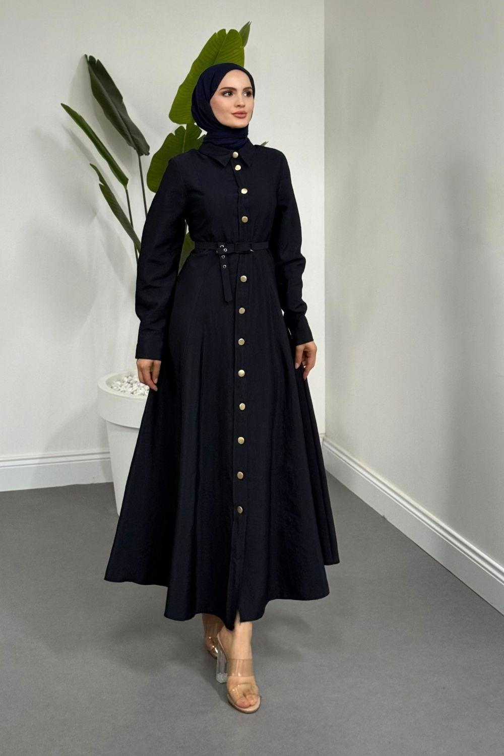 Valira Düğmeli Kemerli Elbise Lacivert (1144)