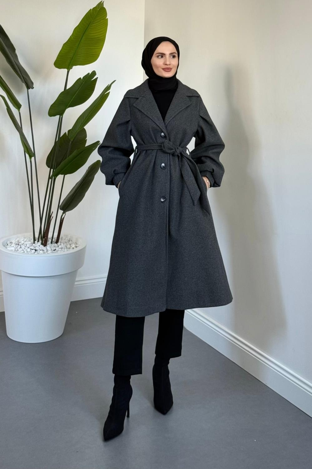 Velura Kuşaklı Astarlı Kaşe Kaban Füme (1155)