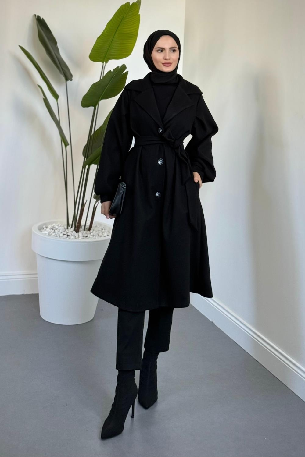 Velura Kuşaklı Astarlı Kaşe Kaban Siyah (1155)