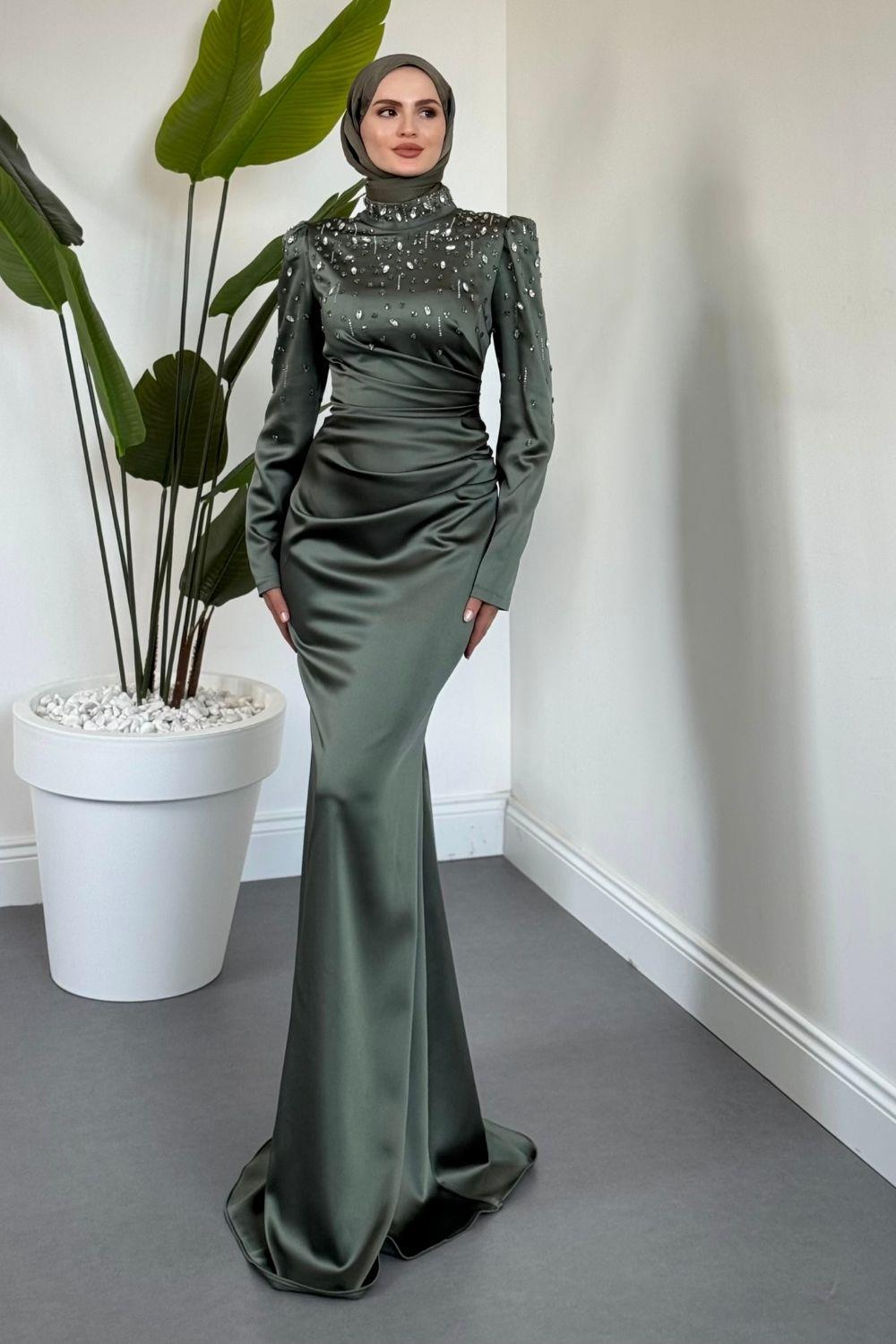 Wanda Saten Taşlı Balık Abiye Haki (2622)