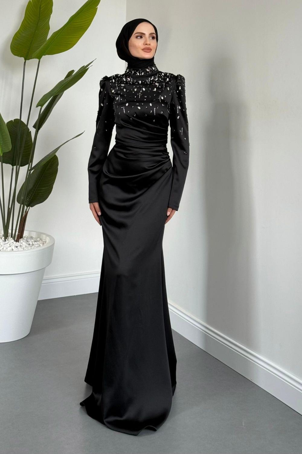 Şıklığı ve ihtişamı bir arada sunan bu siyah saten abiye elbise, taş işlemeli üst kısmıyla göz alıcı bir zarafet sergiliyor.